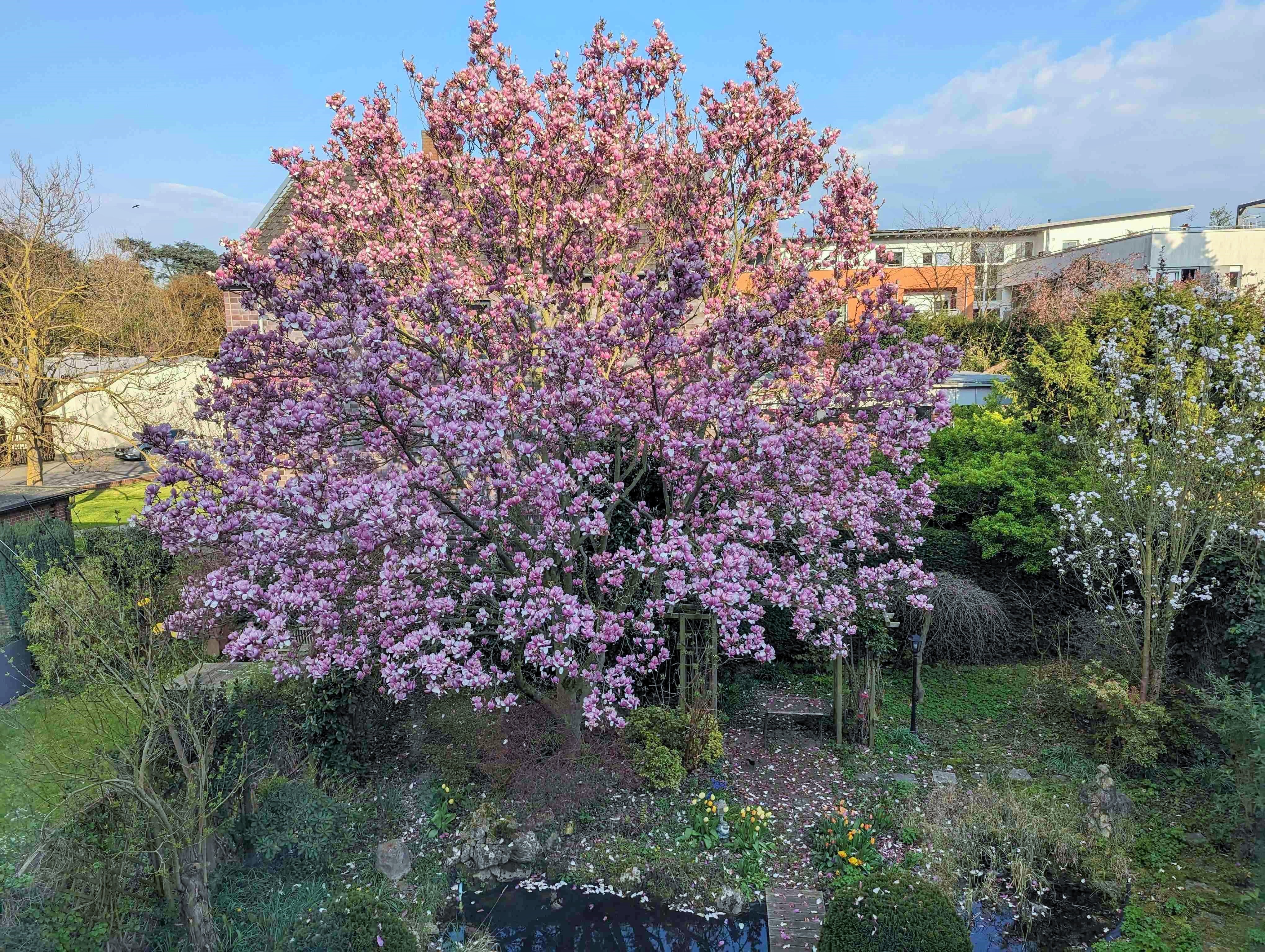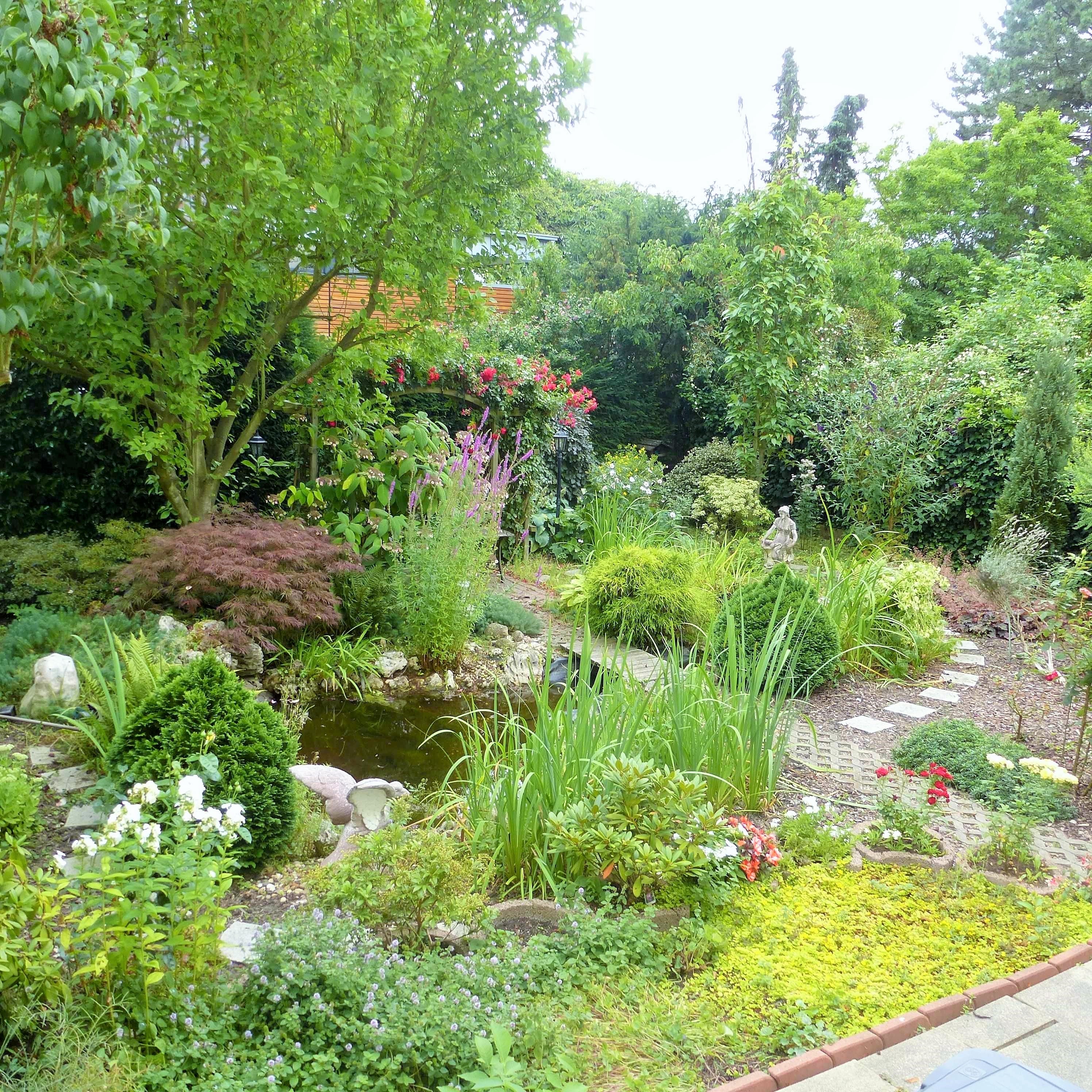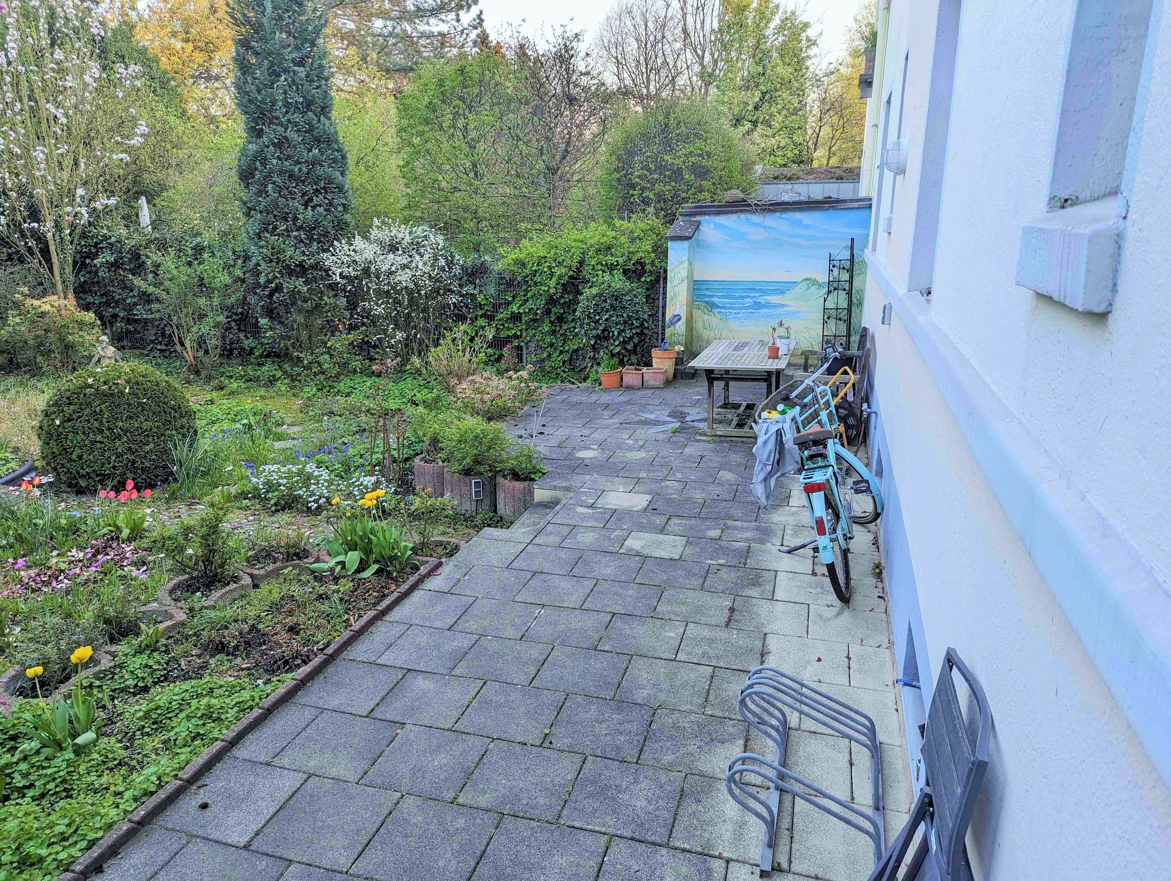Schnellen Schrittes gelangen Sie über das Treppenhaus in den Gartenbereich mit Terrasse und kleinem Teich. Der Garten ist ausschließlich den Bewohnern des Zwei-Familienhauses zugänglich und wird entsprechend genutzt.