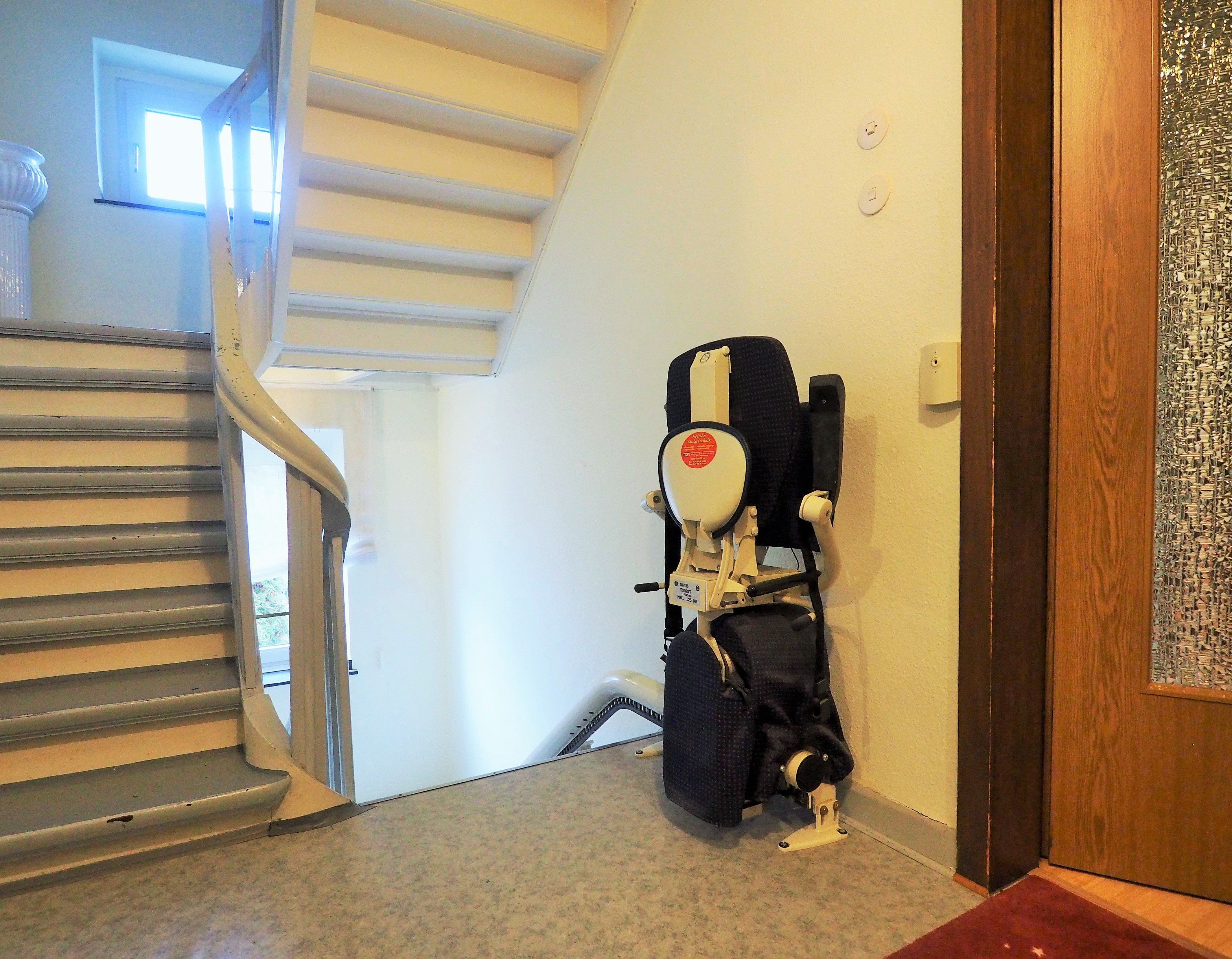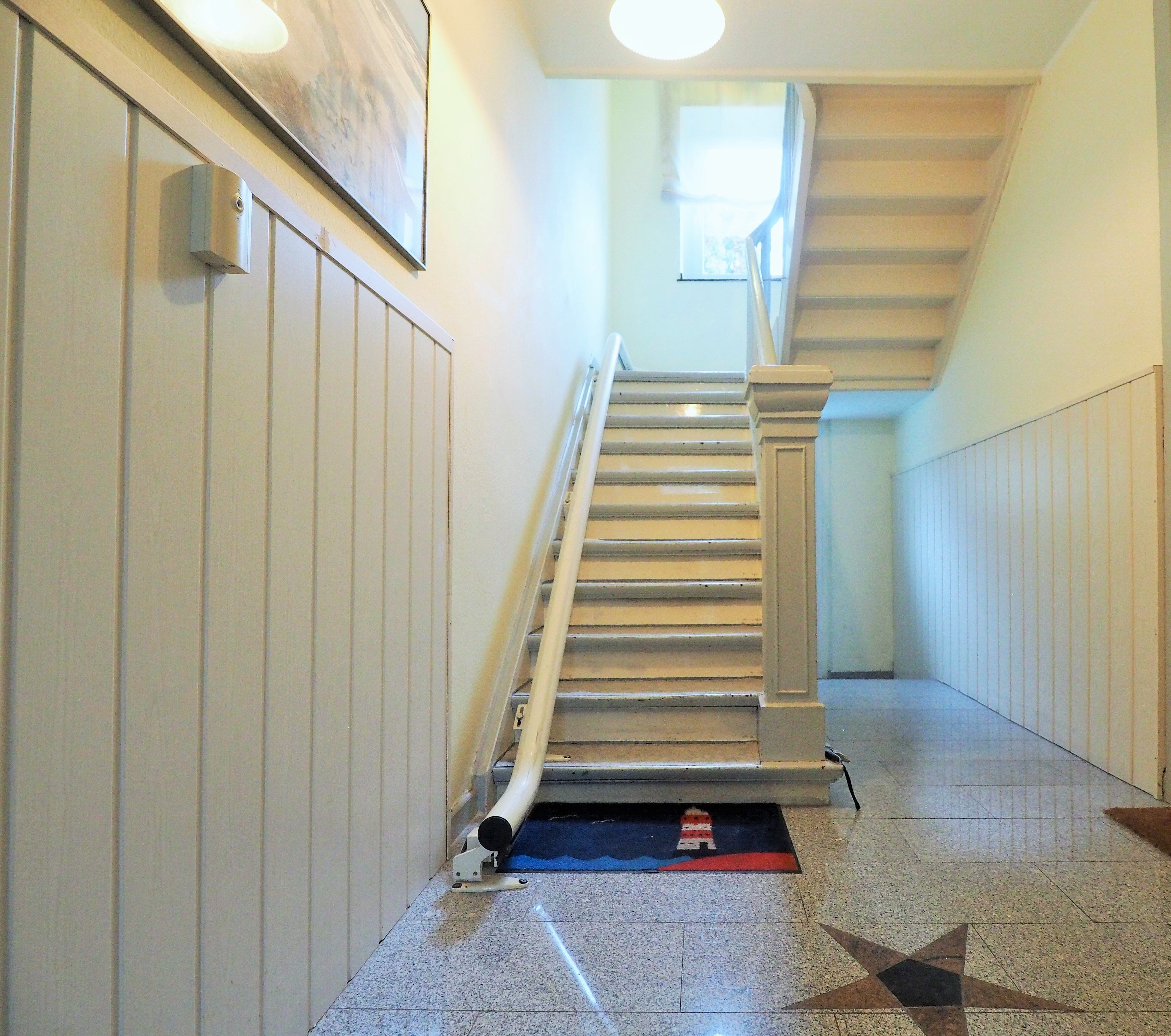 Der Eingangsflur des Hauses mit einer Synthese aus Modernität und Historie begrüßt Sie. Das Holztreppenhaus geleitet Sie zu Ihrer im ersten Obergeschoss gelegenen Wohnung, für Personen mit Beeinträchtigung ist bereits ein Treppenlift installiert.