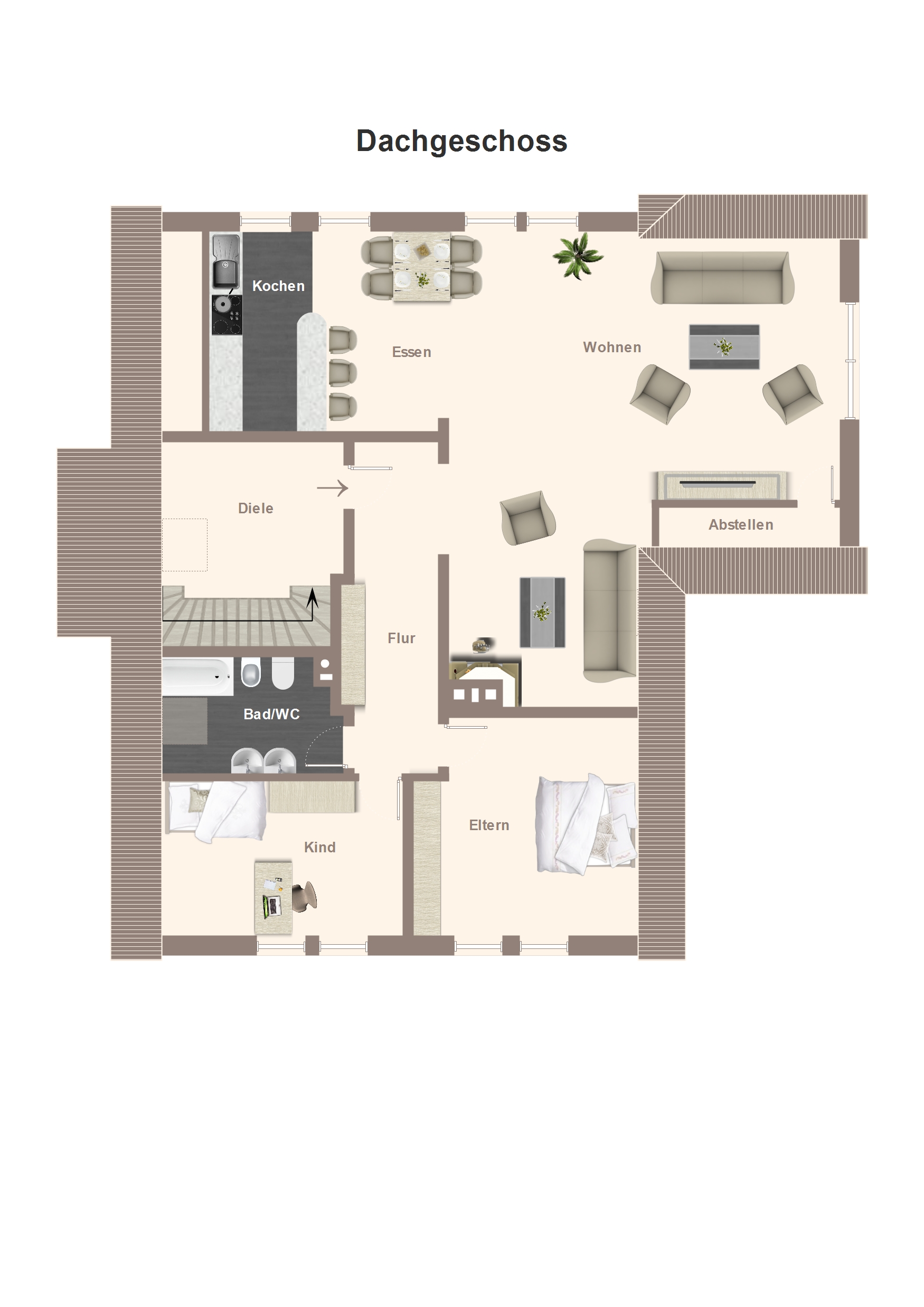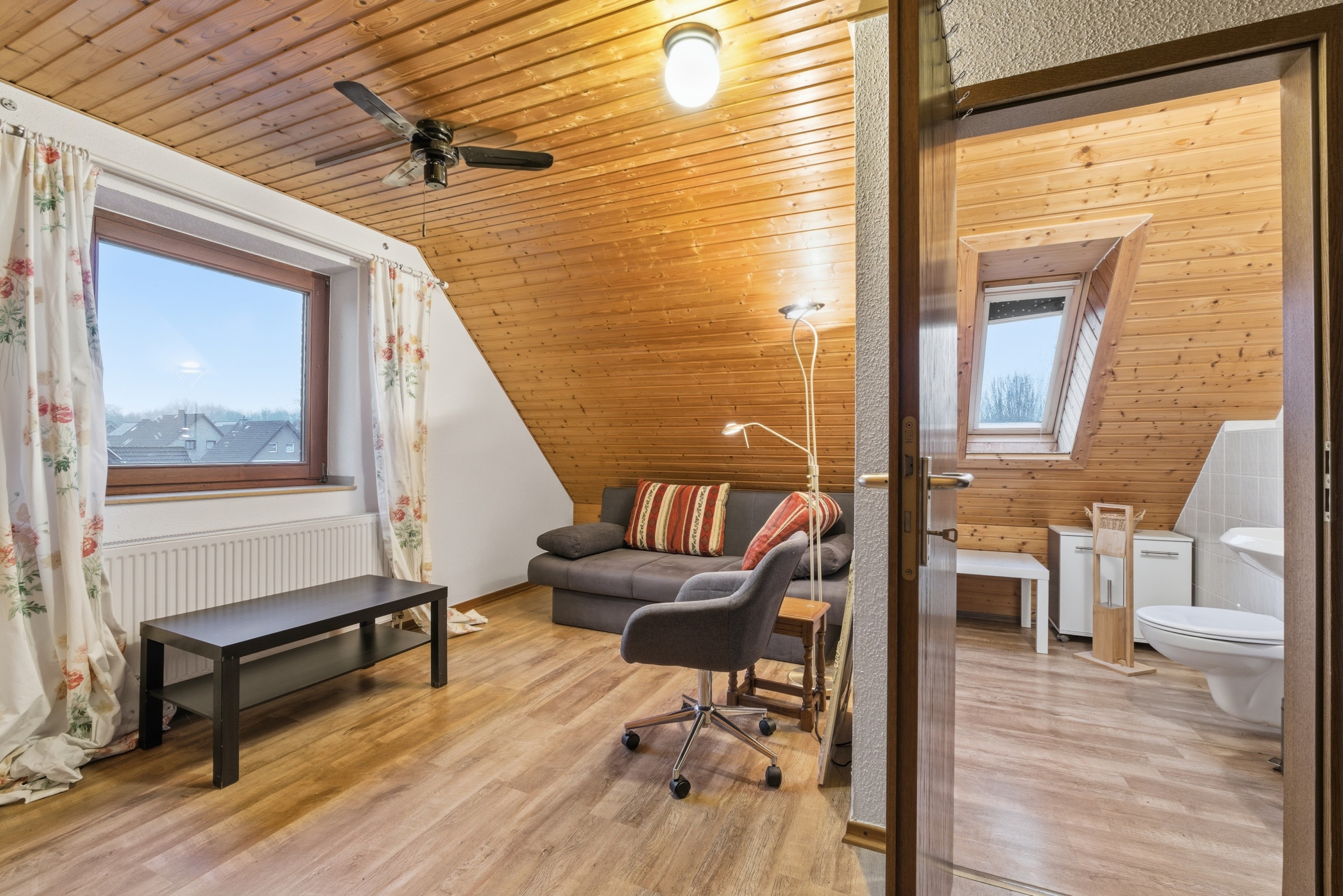 Das Gäste-Apartment in der wohnlich ausgebaute Dachspitze, erreichbar über eine Raumspartreppe ausgehend vom Treppenhaus, bietet Ihnen zwei Zimmer plus kleiner Küche und einem WC. Die wohnliche Nutzfläche findet in der Wohnflächenangabe keine Berücksichtigung.