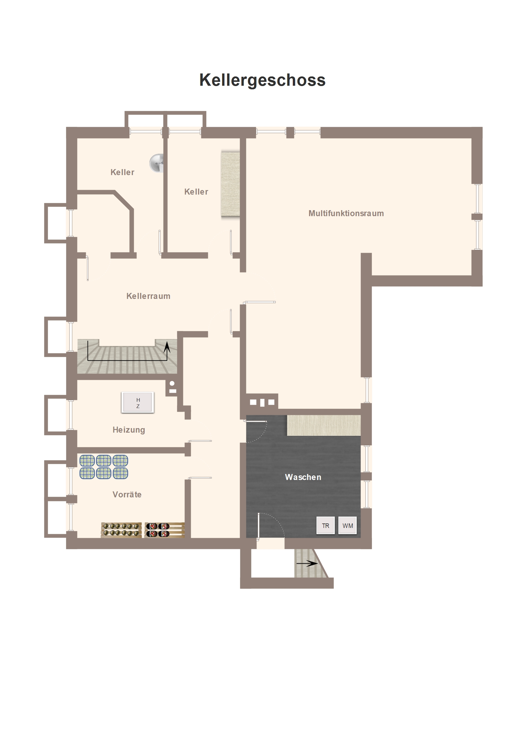 ++ Vollkeller mit Trockenraum mit Gartenausgang, wohnlich ausgebauter Partyraum mit Bar, Hobbyraum, Hauswirtschaftsraum und Vorratsräume