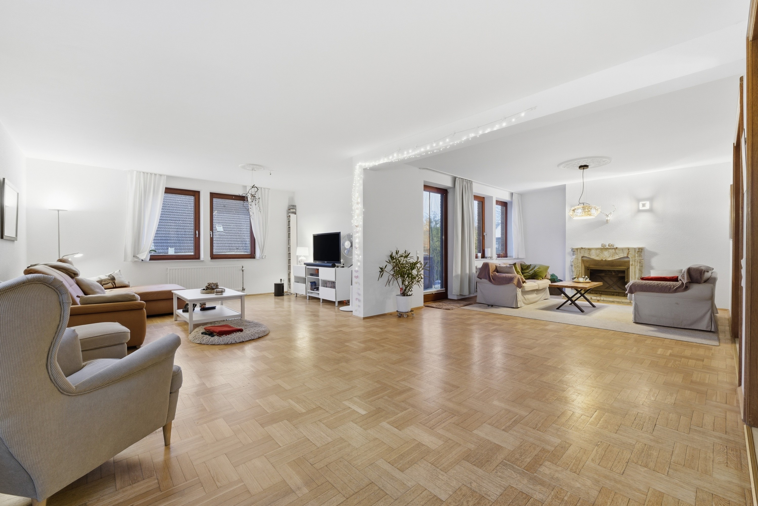 Ausgehend vom großzügigen Entrée des Hauses erschließt sich Ihnen durch eine Doppelflügeltür die Wohnung im Erdgeschoss. Mit einer Wohnfläche von ca. 157 m² überzeugt das Erdgeschoss mit 3 großzügig dimensionierten Räumlichkeiten und wertvollen Ausstattungsdetails, wie Parkettböden in den Wohn- und Schlafzimmern. Wohn-/ und Esszimmer in Kombination mit der offenen Küche alleine bieten eine Wohlfühlfläche von ca. 79 m². Die Küche ist bereits mit einer wertigen Nolte-Küche mit Insel ausgestattet, die im Kaufpreis bereits inkludiert ist. Im großen Wohn- / und Esszimmer garantiert der Onyx-Kamin mit Heizkassette Behaglichkeit und Wärme! Von der an das Wohnzimmer angrenzenden Hochterrasse gelangen Sie direkt in den großen Garten, der das Haus umschmiegt.