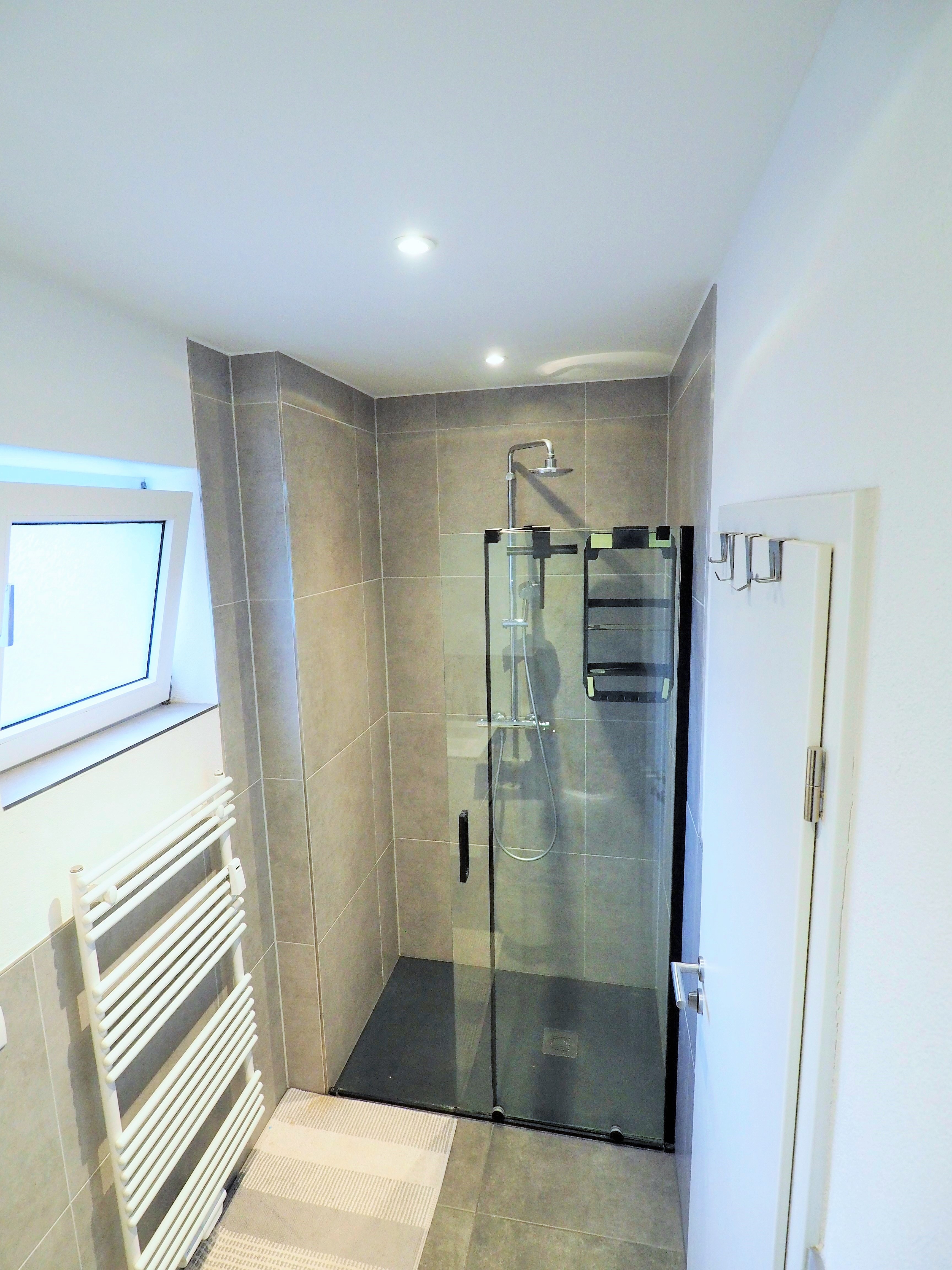 Von hier aus erreichen Sie ebenfalls das moderne im Wesentlichen mit grauen Fliesen und weißen Sanitärelementen ausgestattete Bad (5,00 m²) mit barrierefreier Dusche und Fenster. Das große Schlafzimmer (18,90 m²) finden Sie direkt ausgehend vom Eingangsflur.