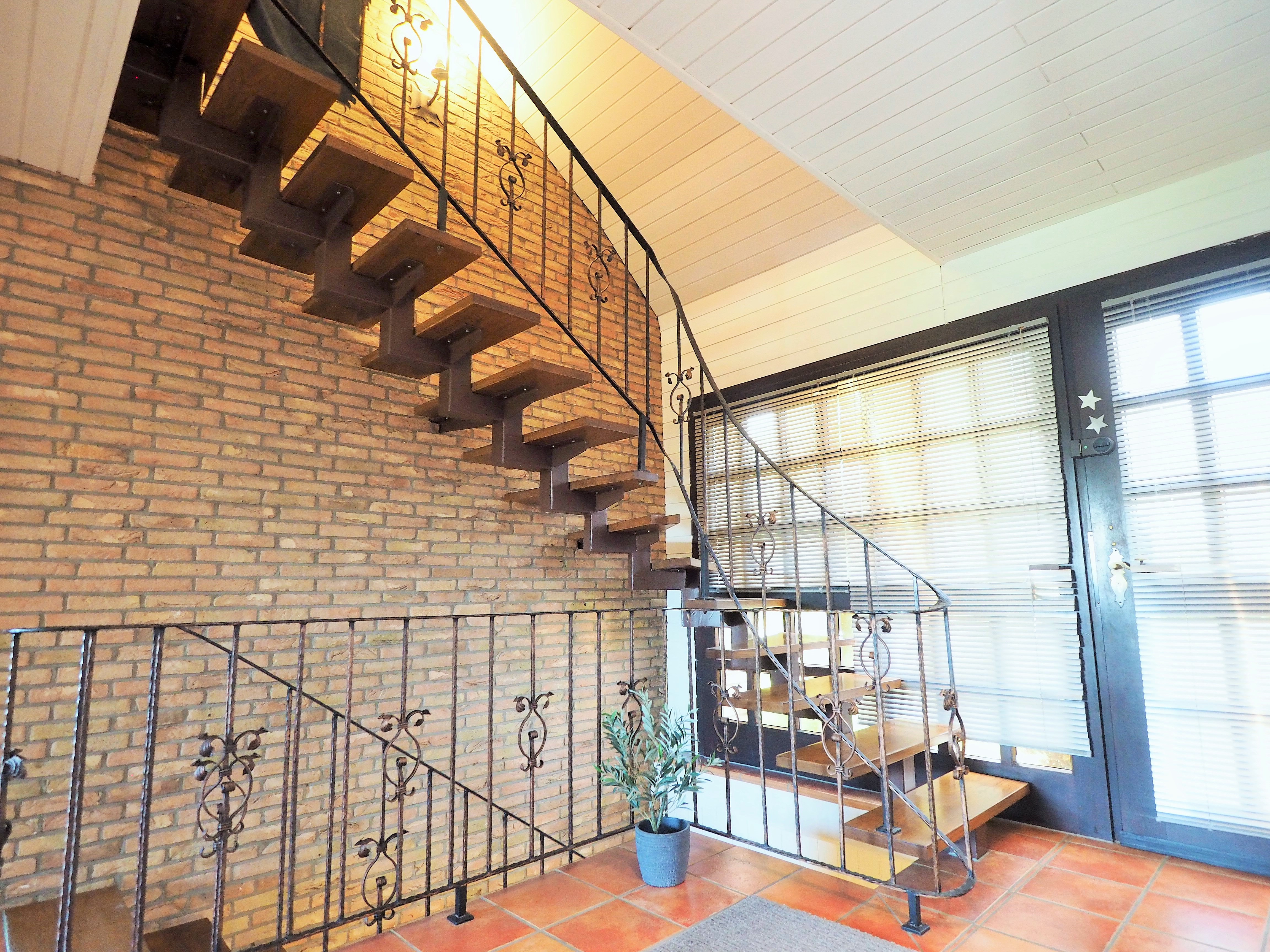 ++ offene Treppe mit Holzstufen zum OG, mit Abstandhalter der Treppenstufen zur Wand