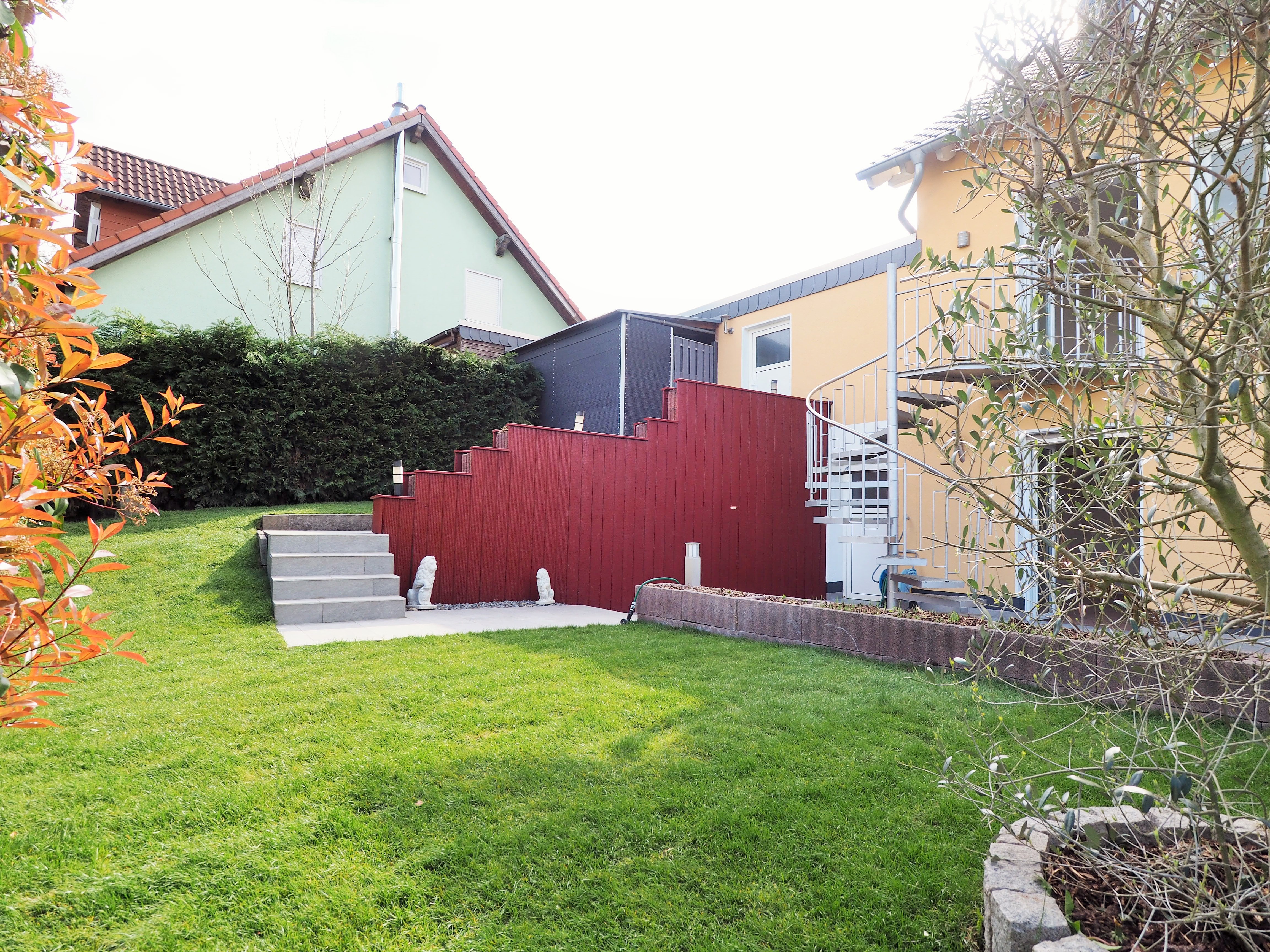 Der frisch & ansprechend gestaltete sowie pflegeleicht konzipierte, abgetrennte Sonnengartenbereich mit Terrasse überzeugt und bietet viel Raum zum Relaxen und als Spielplatz für die Kinder. Den Garten erreichen Sie sowohl über eine Wendeltreppe aus dem Wohnzimmer als auch über eines der Kinderschlafzimmer des Untergeschosses. Die Einzelgarage ist auch vom Garten her erreichbar sowie voll unterkellert und bietet somit eine mehr als großzügige Gesamtnutzfläche.