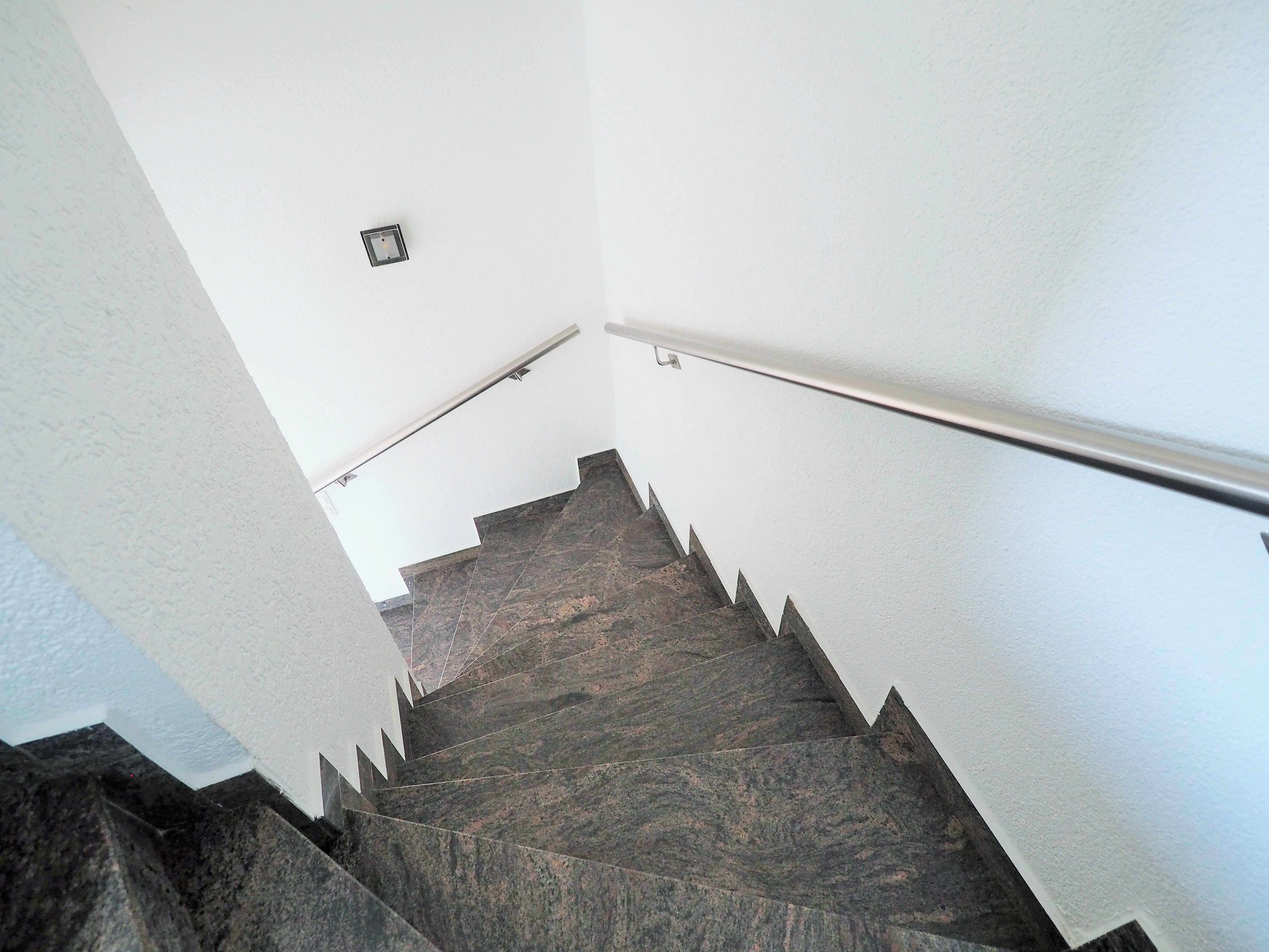 Treppen : Stahlbetontreppen mit Granitsteinbelag und Edelstahlhandlauf zum Keller- sowie zum Dachgeschoss