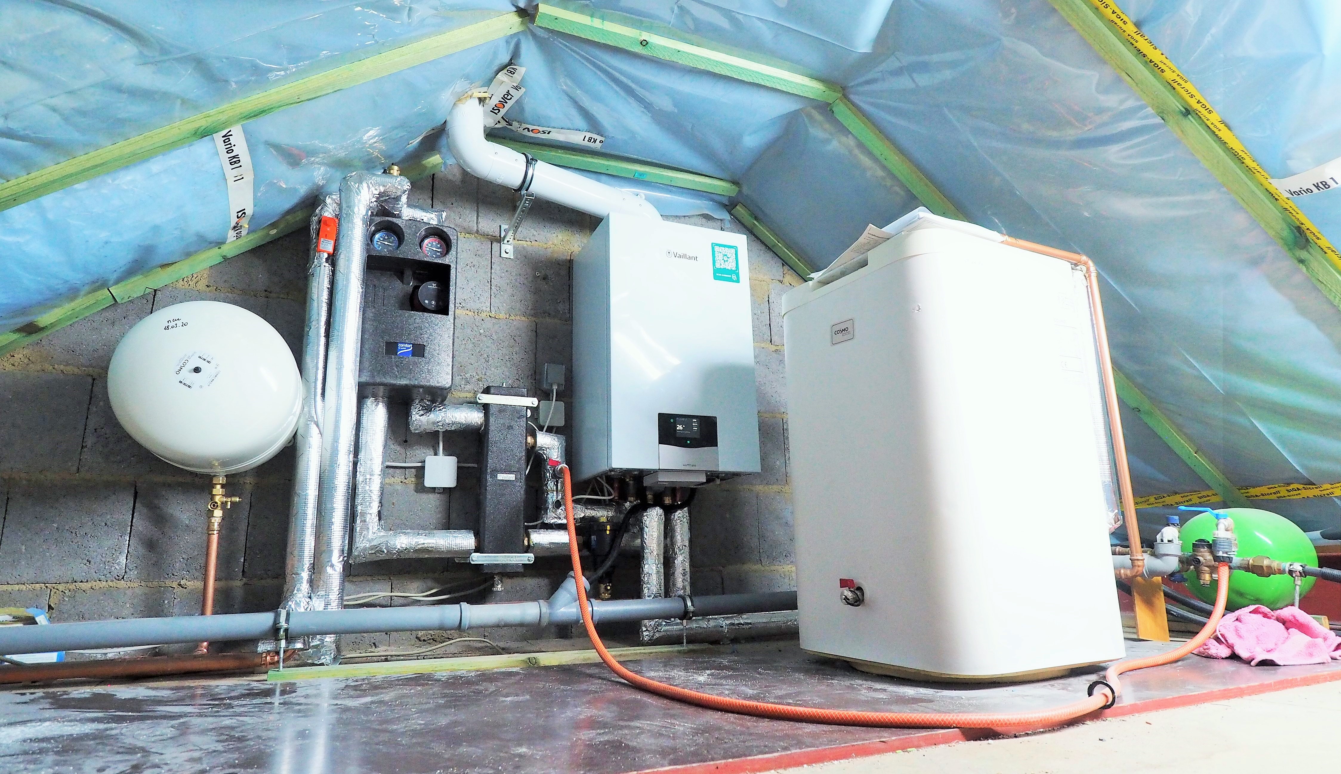 Heizung : Gas-Brennheizung mit Warmwasserspeicher der Marke Vaillant als Fußbodenheizung erwärmt, Einbau 2024/25, gelegen im Spitzboden als Fußbodenheizung mit Raumtemperatur-Regler