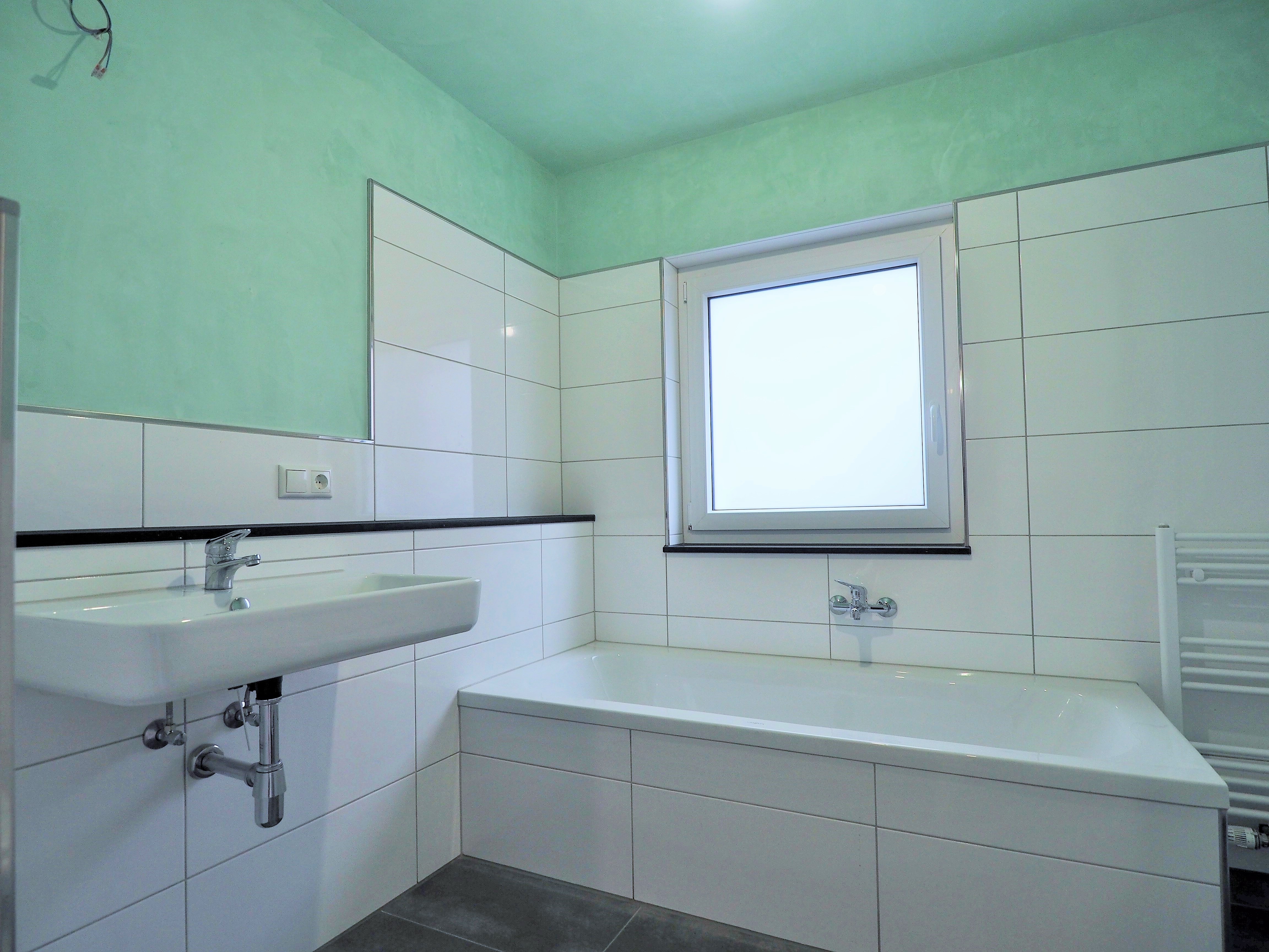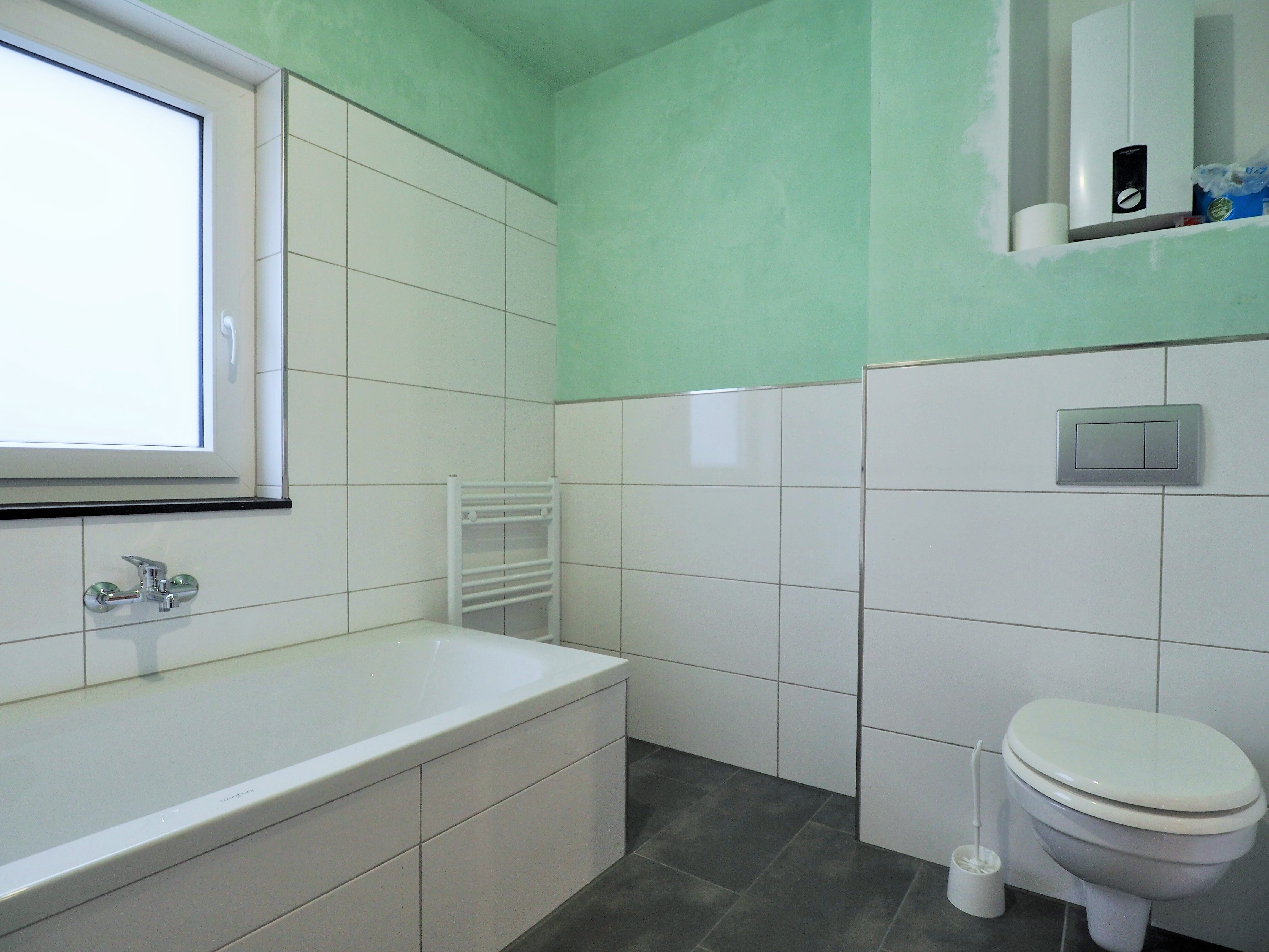 Orientieren Sie sich vom Eingang rechts, gelangen Sie in den großen Flur mit Treppenaufgang zum Dachstudio. Das ebenfalls vom Flur zugängliche Wannenbad mit Waschtisch und WC präsentiert sich top-modern mit einer Größe von knapp 6 m².